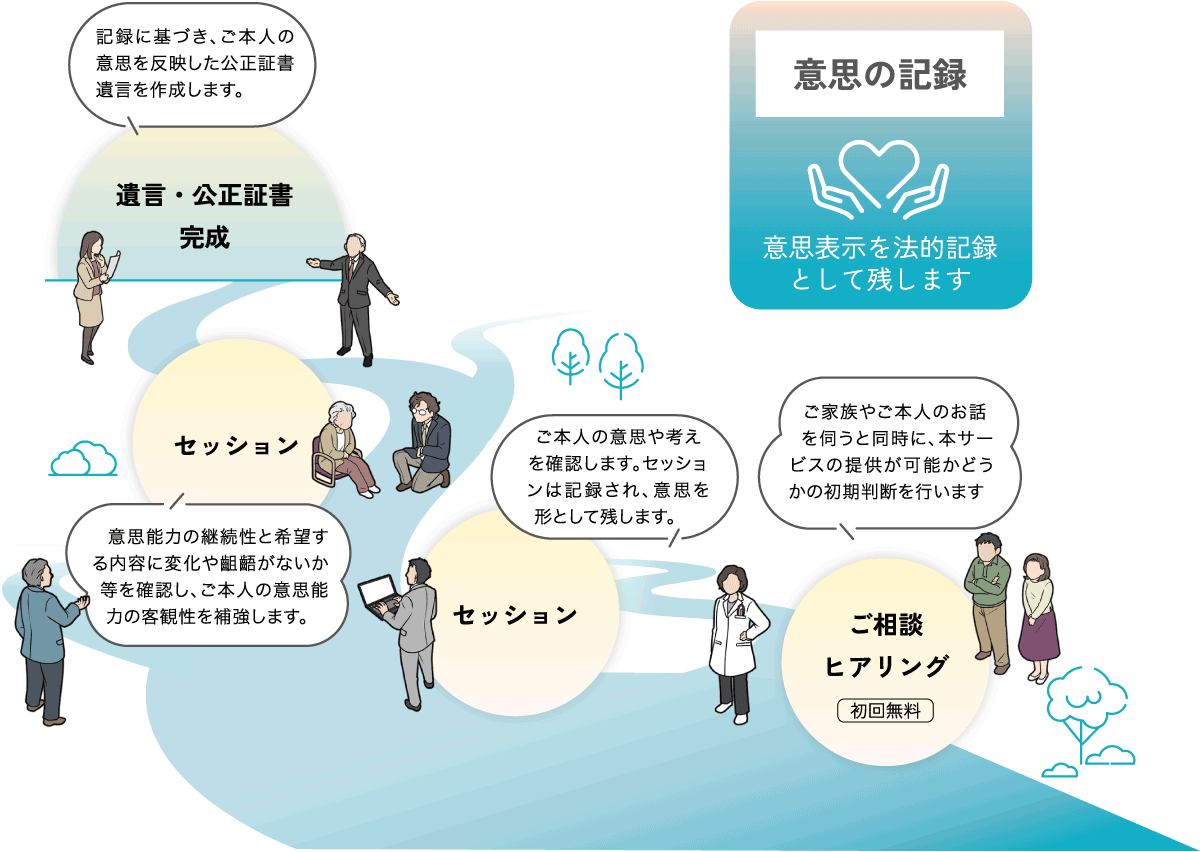 ※本サービスは、ご本人さまの意思を「保全する」「形に残す」サービスであり、例えば、ご本人以外の意思を汲み、ご本人の意思に反した方向へと誘導することはありません。